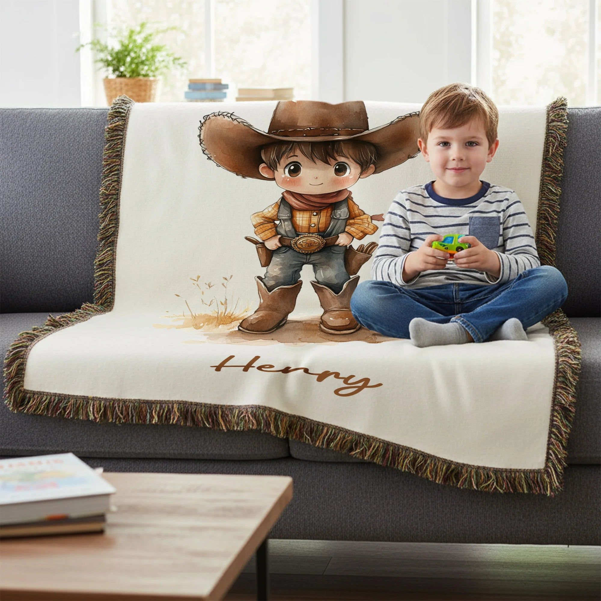 Personalized Cartoon Cowboy Cowgirl Tassel Soft Throw Blanket with Name Home Decor Birthday Gift for Kids Cowboy Lovers