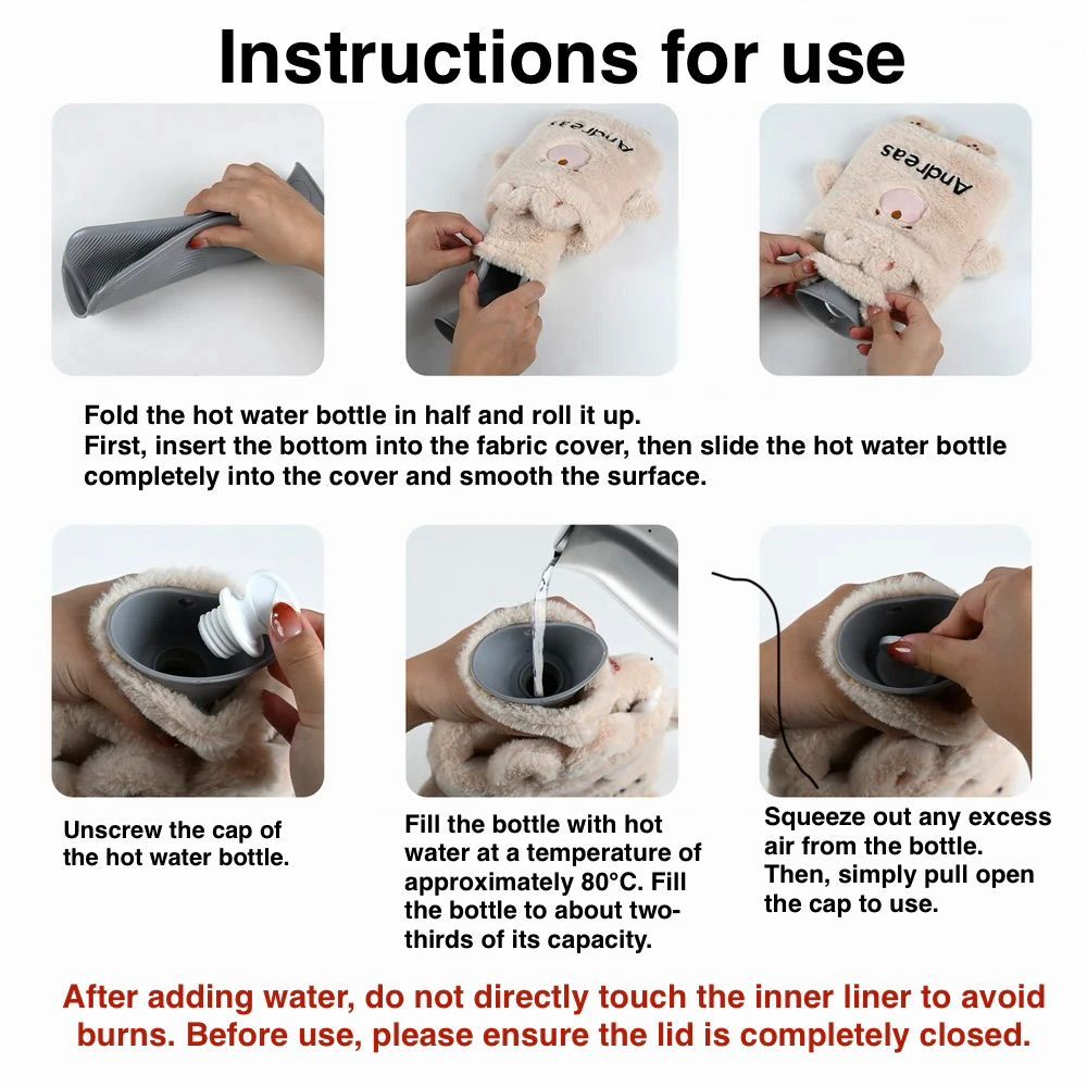 Personalized 1-liter plush hot water bottle with adorable animal designs and the option to have your name printed on it - perfect for home, travel, birthdays, winter, Christmas, or as a gift for kids and friends.